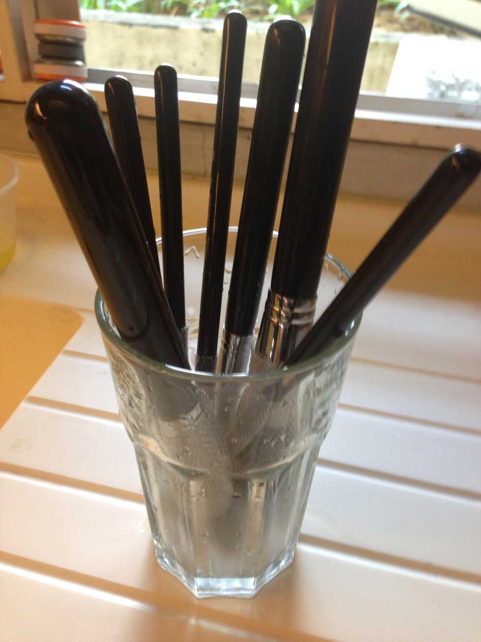 Put the brushes in a tall glass facing the brush down! This way it will prevent the water from sitting in the glue base which will make the fur fall too soon. Let it dry in airflow area