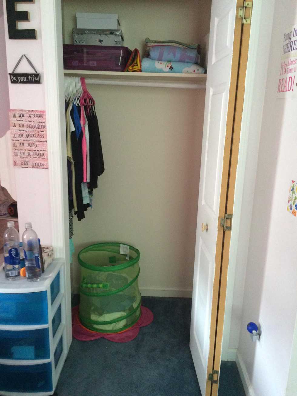 My closet is small so I don't have a lot of floor space in it. I put my clothes hamper on the floor and put a mat under it in case I have any wet towels or bathing suits in my hamper.