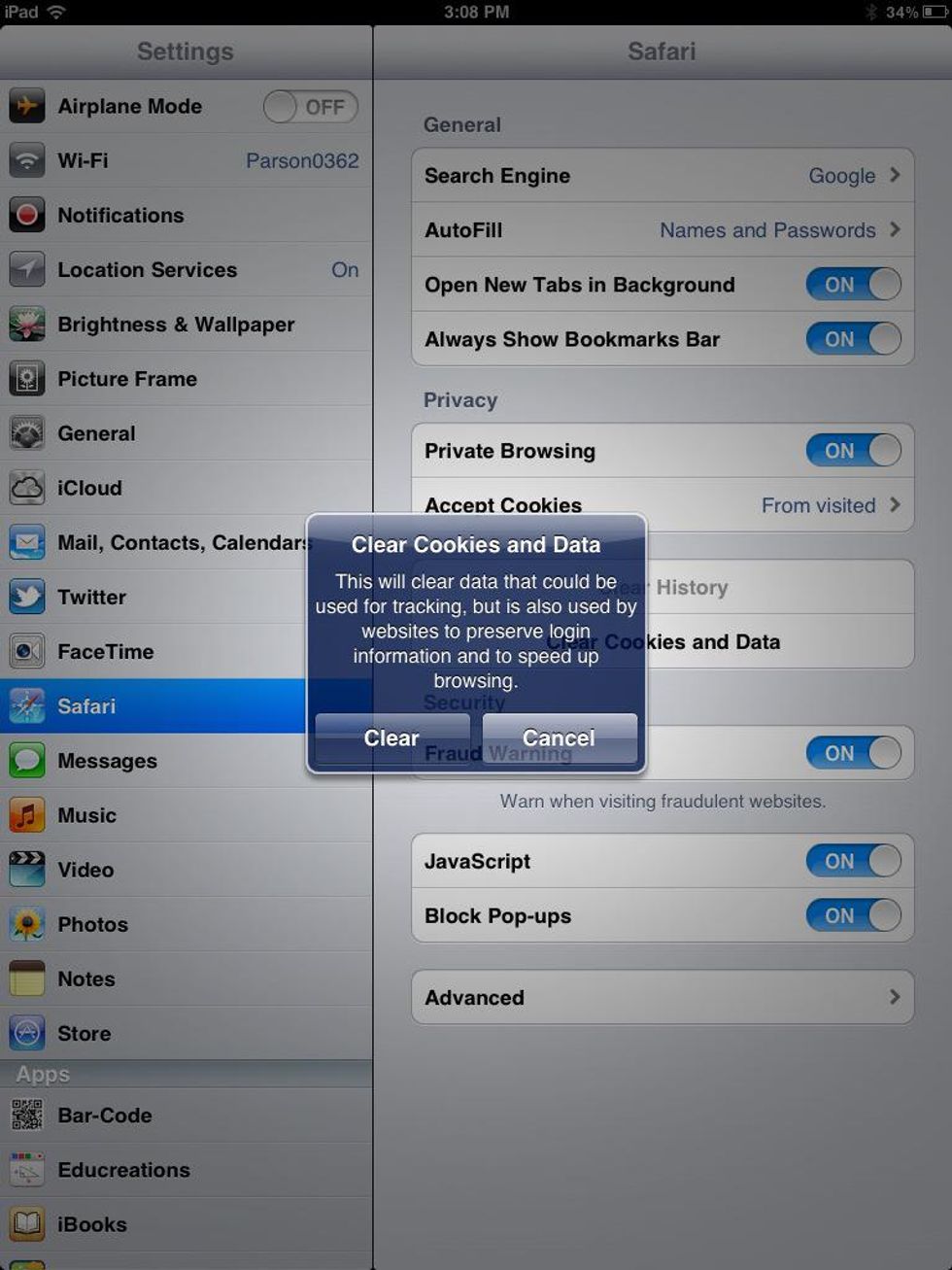 About equal to it in the right hand column are the clear options (They may be different than mine based on the version of iPad you have).