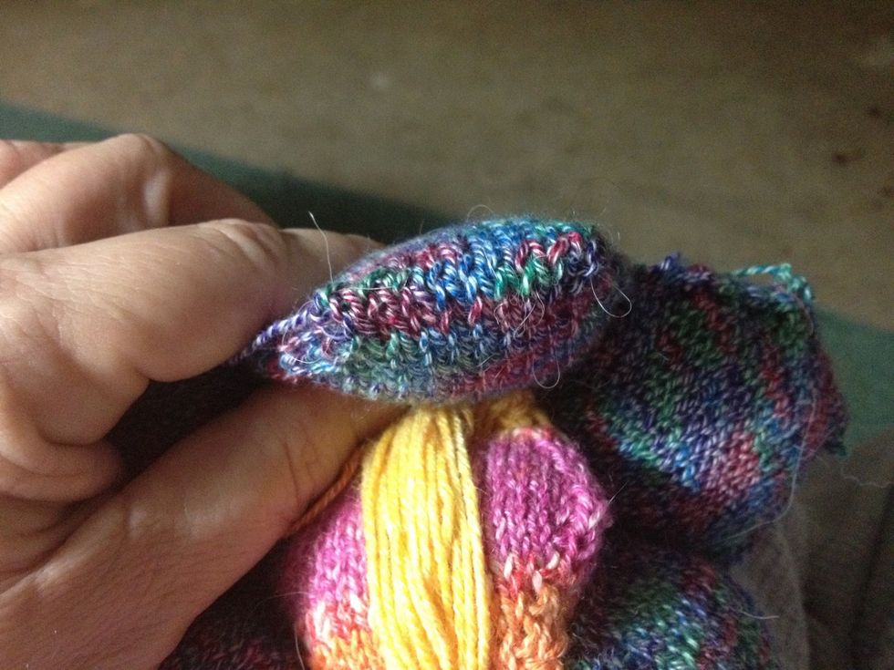 Place live stitches on needles smaller than those used to knit the puff -- just to make seeing & doing the grafting easier. Be sure the stitch with the working thread is on the back needle (from you).