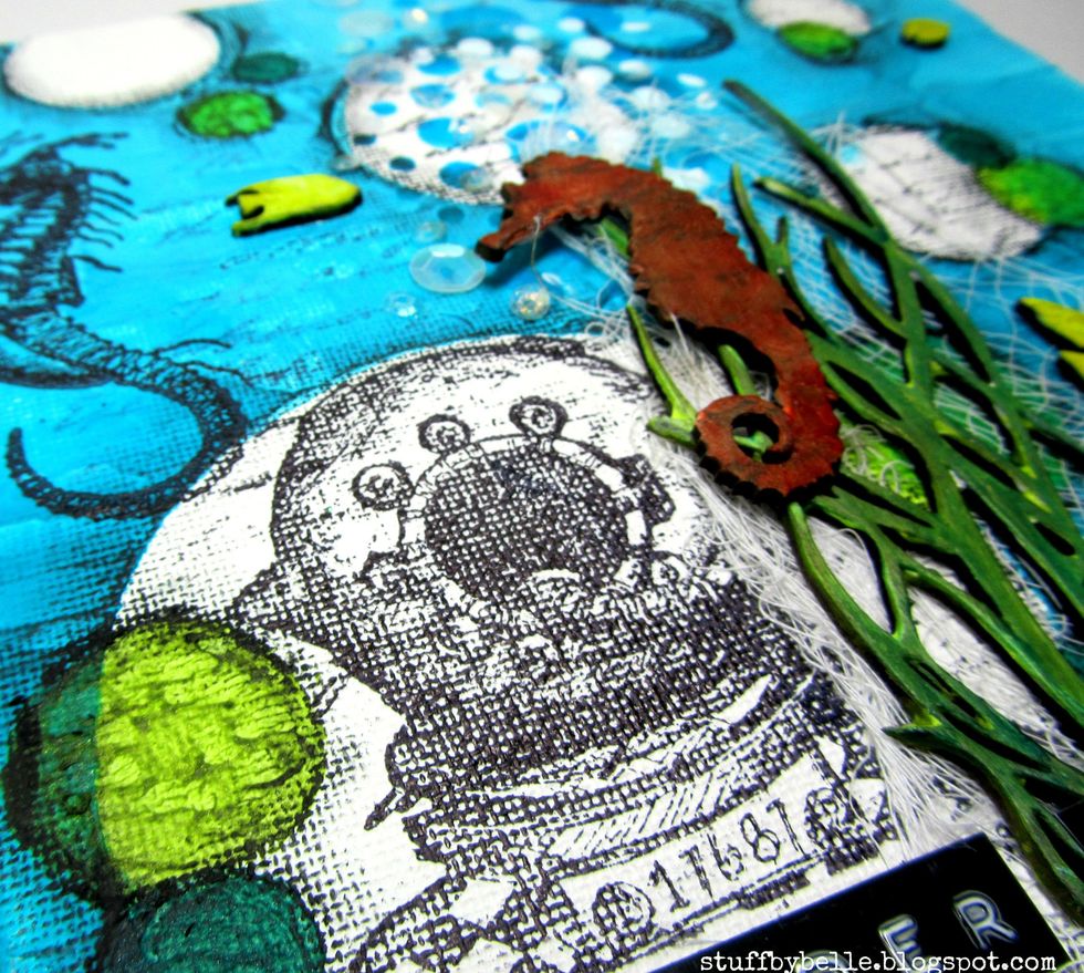 I stamped with archival ink randomly with the Writing Background stamp and stamped the diver where I wanted my biggest bubble.