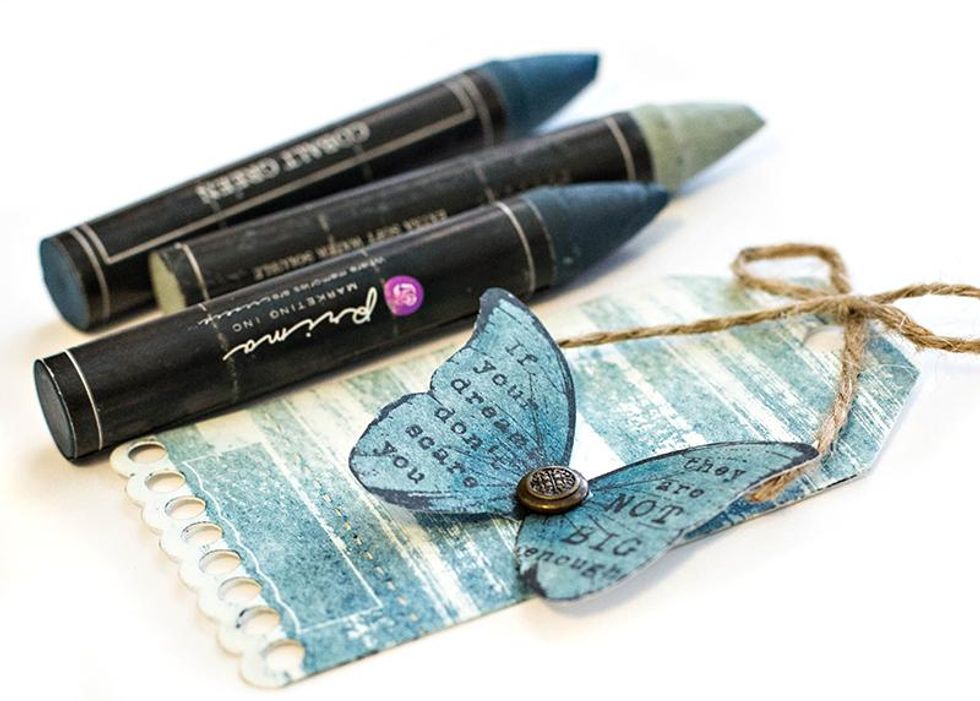 Cut out the butterfly and add to the tag. Adhere a metal embellishment to the center of the butterfly. Tie the string that comes with the tags in a bow, and add to the top to finish off the tag.