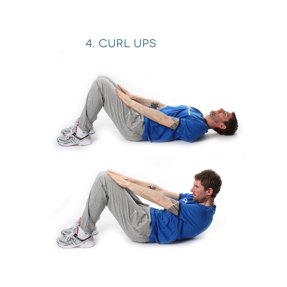 Curl ups - Time to work the Abdominals. Lie on your back, knees bent, feet flat on the floor & hands on your thighs. Curl up so that your hand reaches your knee & return. Repeat 15 times