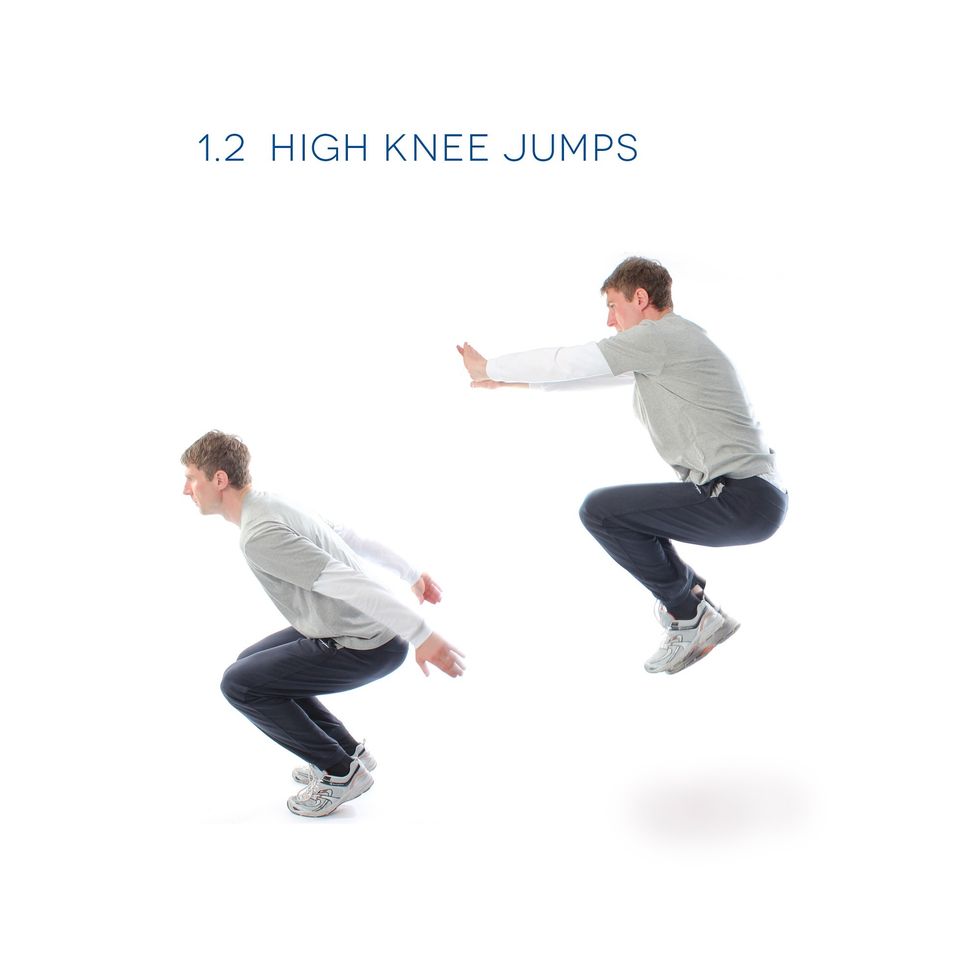 High Knee Jumps (Part 2) - Then do 5 high knee jumps. Jump as high as you can, lifting your knees up as you come up. Repeat this with the heel jumps 5 times
