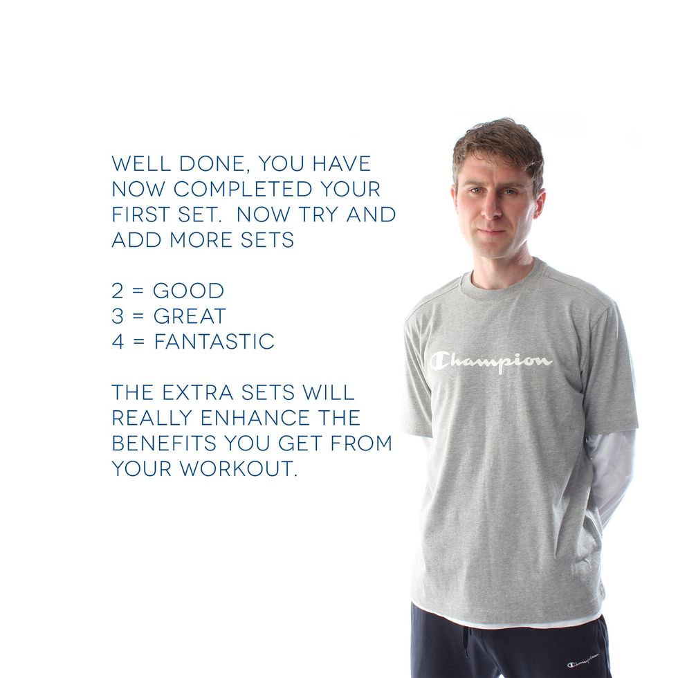 Overhead Sumo Squat - Wide pace, feet pointing outwards, holding a t-shirt over your head. Sit back with your knees not coming over your toes focussing on keeping your back straight. Repeat 15 times