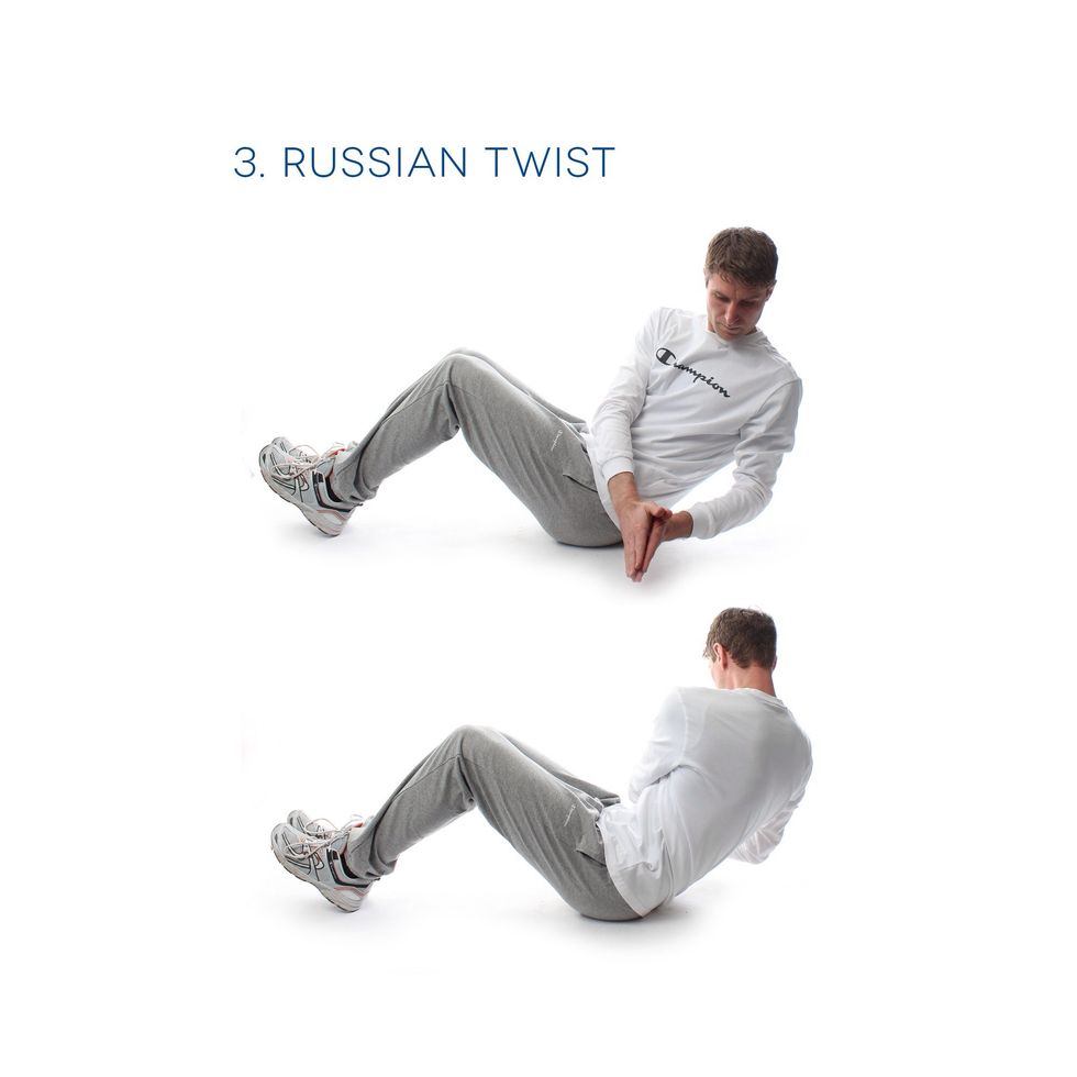 3. Russian Twist - This is for your Core strength. Sit with your knees and feet together, leaning back slightly. Slowly twist to one side and then the other. Perform 30 (15 on each side)