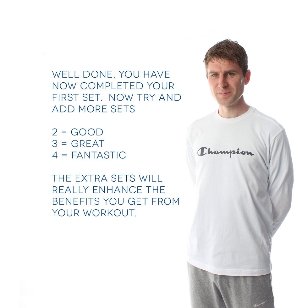 5. Press Ups - Let's work out the chest and arms. Start in a high plank position. Keep a straight line through your lower body. Lower yourself and push back up. Do 12 of these.