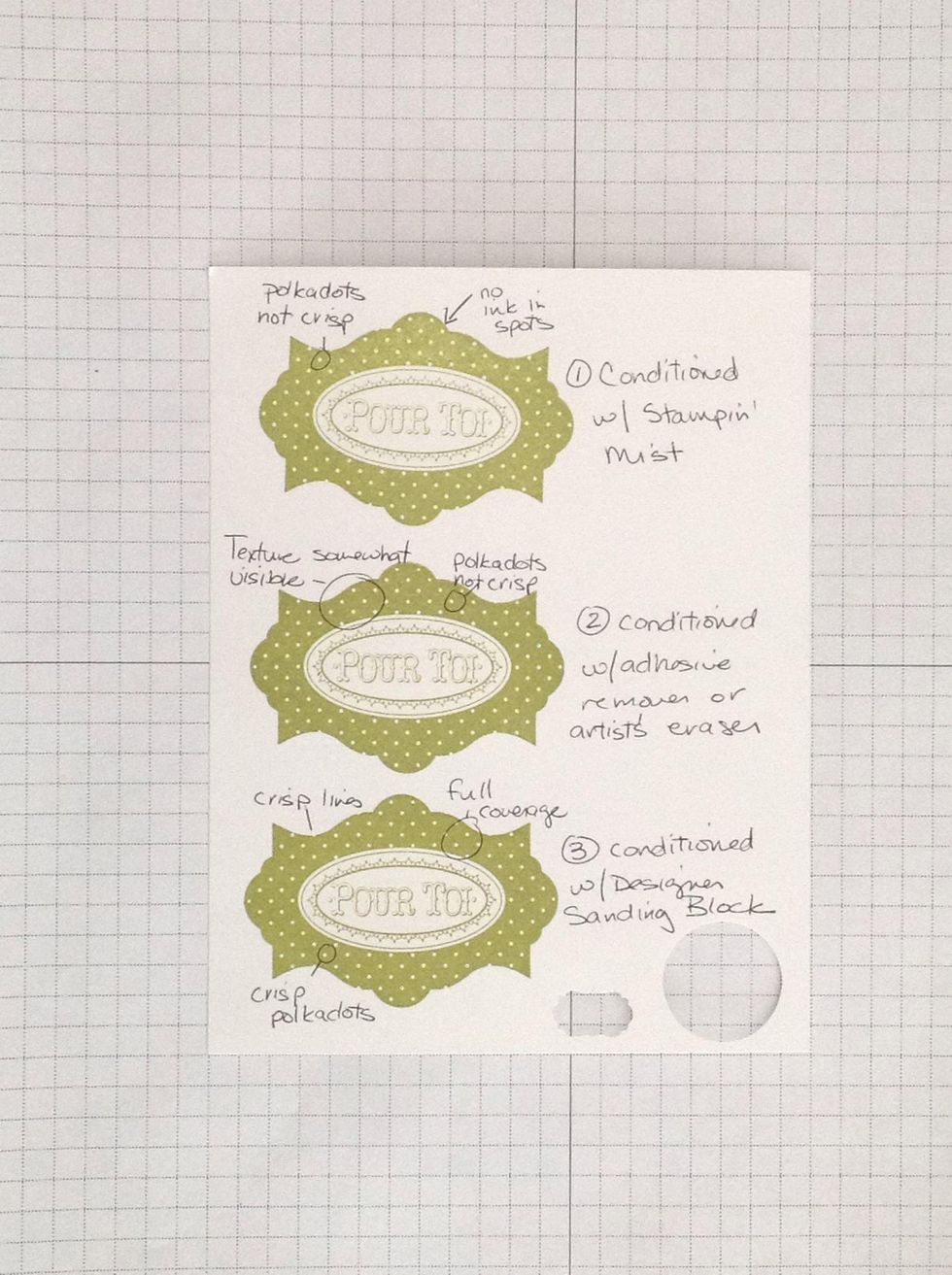 Here's my three progressive tests. You can see that a few minutes of conditioning really improved the quality of the stamped image. Now, off to stamp!!!