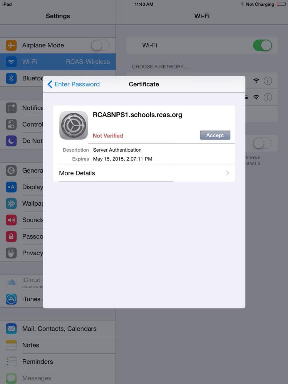 Tap "WiFi" to list the available networks. Tap the little blue i next to RCAS-wireless to reveal in information screen. There may or may not be a blue check mark next to RCAS-wireless.