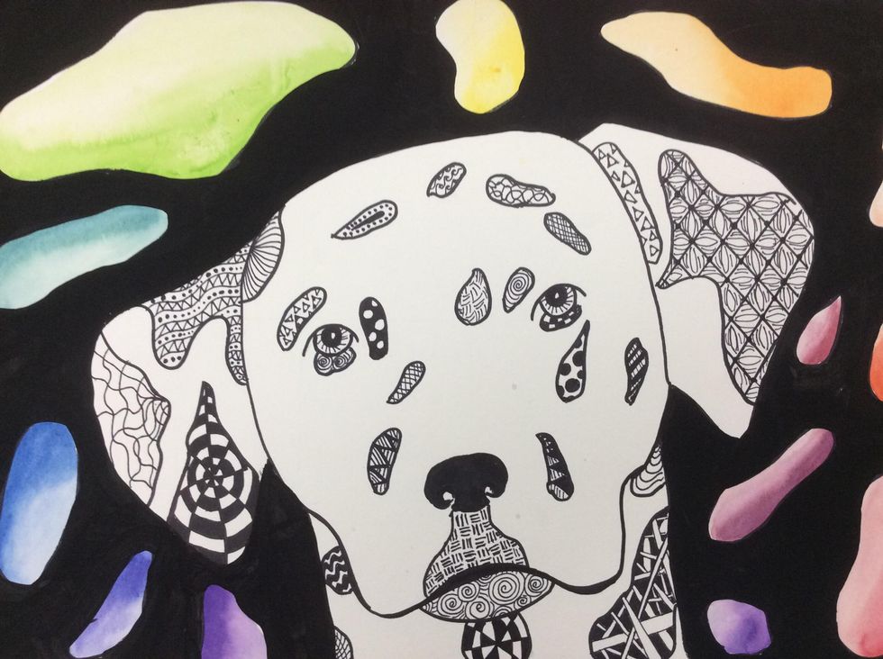 Watercolor ALL 12 colors of the color wheel in the background. Be sure to use 2 values (dark and light) in each spot or stripe. If you have extra spots or stripes, try making new colors!