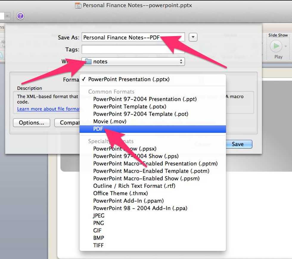 Add "PDF" at the end of the file name, choose where you want it to save, than choose "PDF" as the Format.