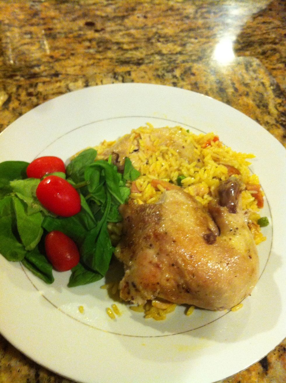 heat the pan.. add some oil and stir te onions celery and garlic .. add the chicken rice and ham... some green peas and stir...add the chicken broth... no salt ham and broth has plenty... cover well