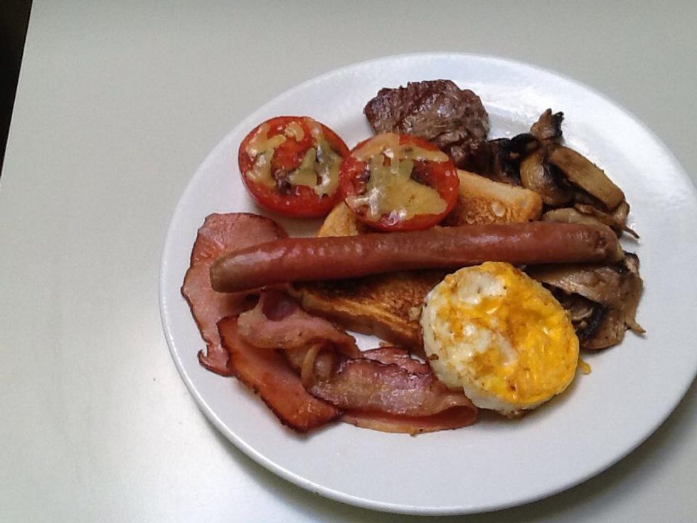 Place the chops, sausages, bacon and eggs onto a tray when cooked.