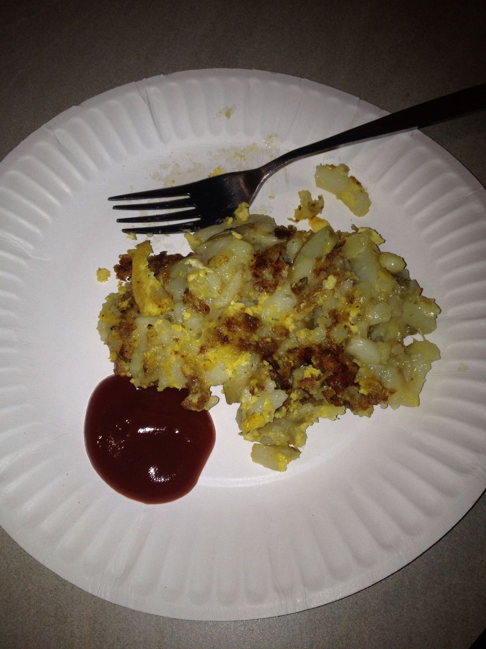 Pour over potato pie and lightly stir. Serve as soon as egg is cooked :)