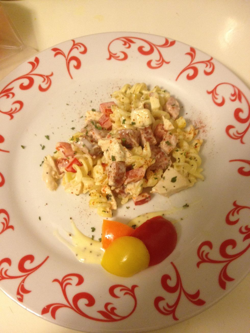 Add peppers and cheese to pasta, then chicken and sausage and finally add the creamy sauce