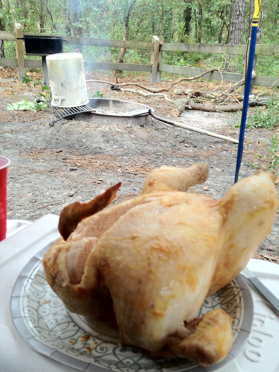 After your fire has burnt down to just coals, put your chicken on a stick with aluminum foil on the bottom, clear out the coals ( so your stick doesnt burn) and stick it in the ground