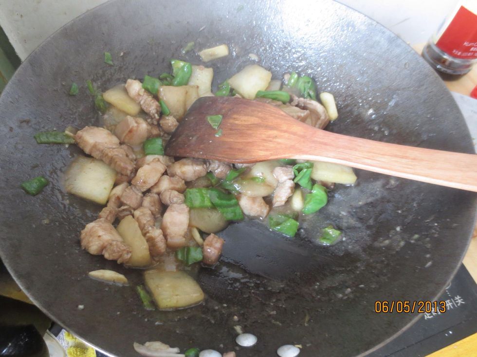 Add marinated pork and stir fry until almost cooked on medium heat