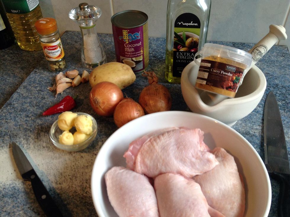 Sauté the garlic, onions, chilli pepper and cardamom seeds until the onion is translucent. In your large wok melt the butter, then throw and mix your curry powder, then add the coconut milk.