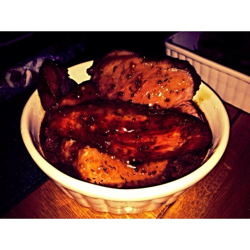 Prewarm your oven on 175 °C. Mix the cloves, honey, oil, dill and mustard in a bowl. Spread the mix over the ham and put it in the oven for about 75 minutes. Bon appétit!