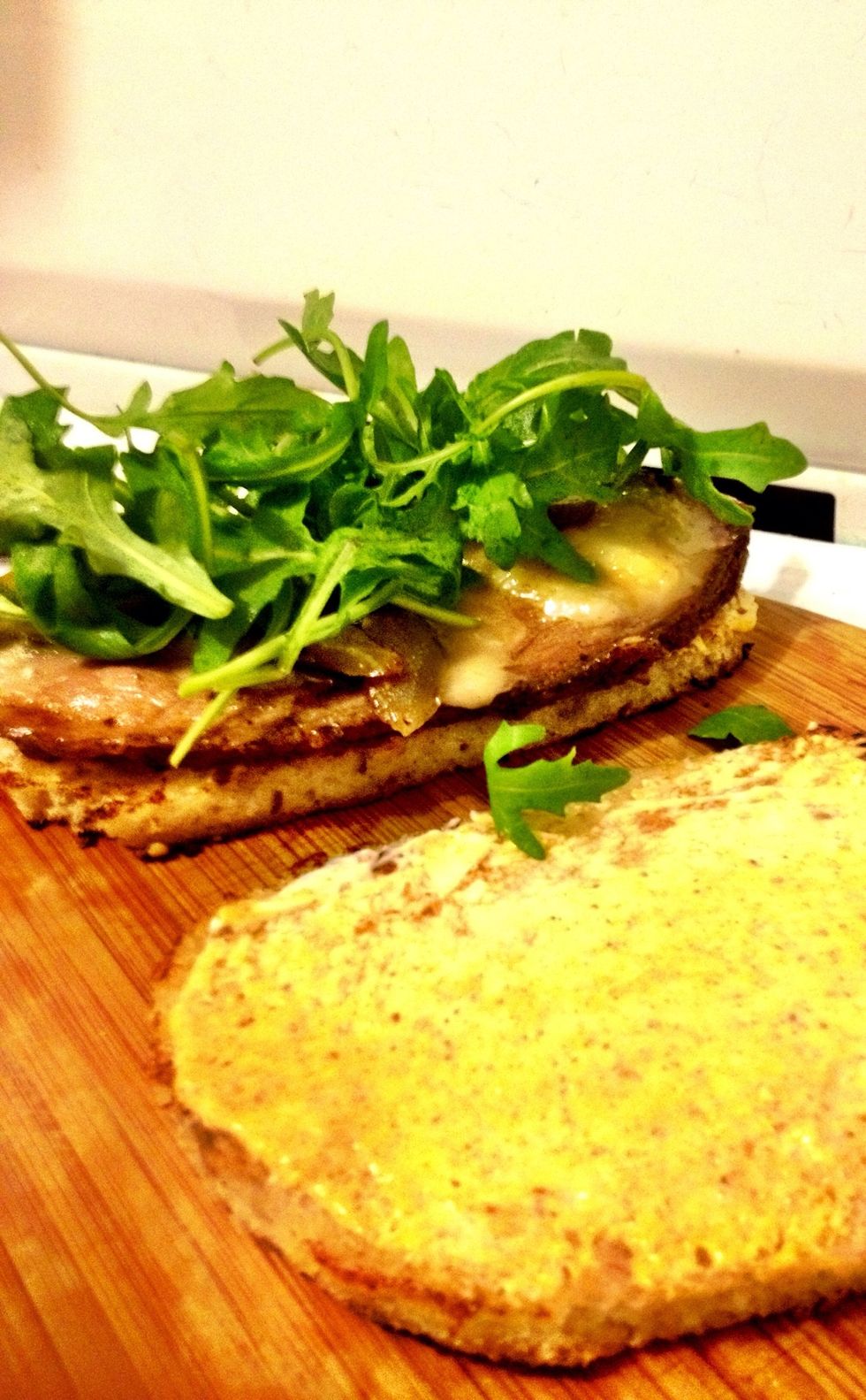 Spread mayo and mustard on both slices of the garlic bread and add the cooked roast beef. Top with some fresh Arugula.