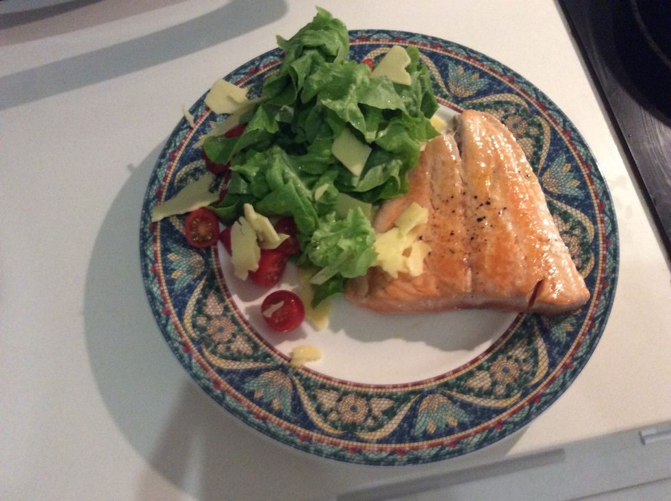 While the salmon is cooking make the salad. Add lettuce tomato cucumber cheese and a bit of dressing, you can use vinegar and salt. Just make sure you wash everything.