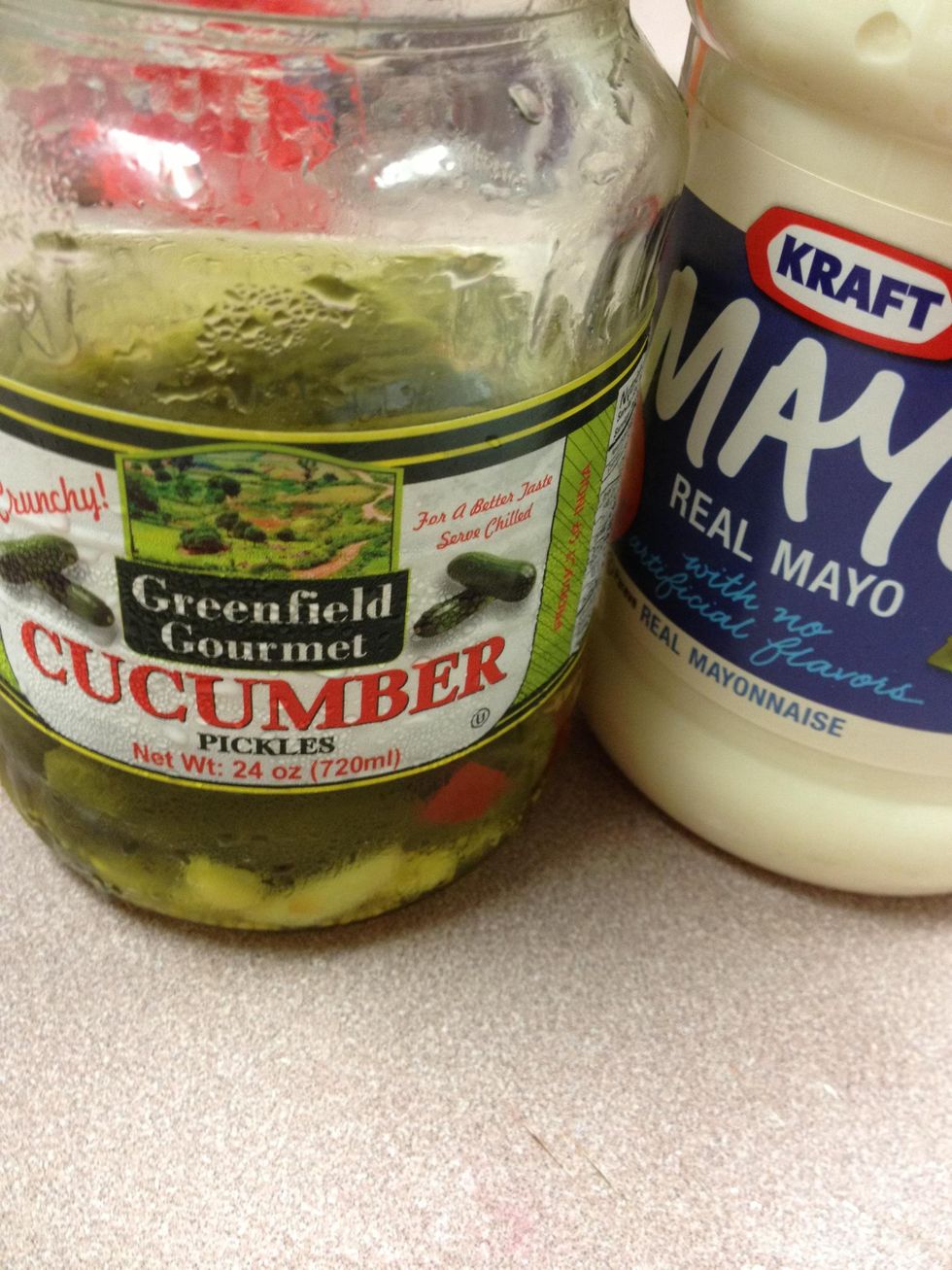 Finely chop some pickles and onions then stir in 2 spoonfuls of Mayo.