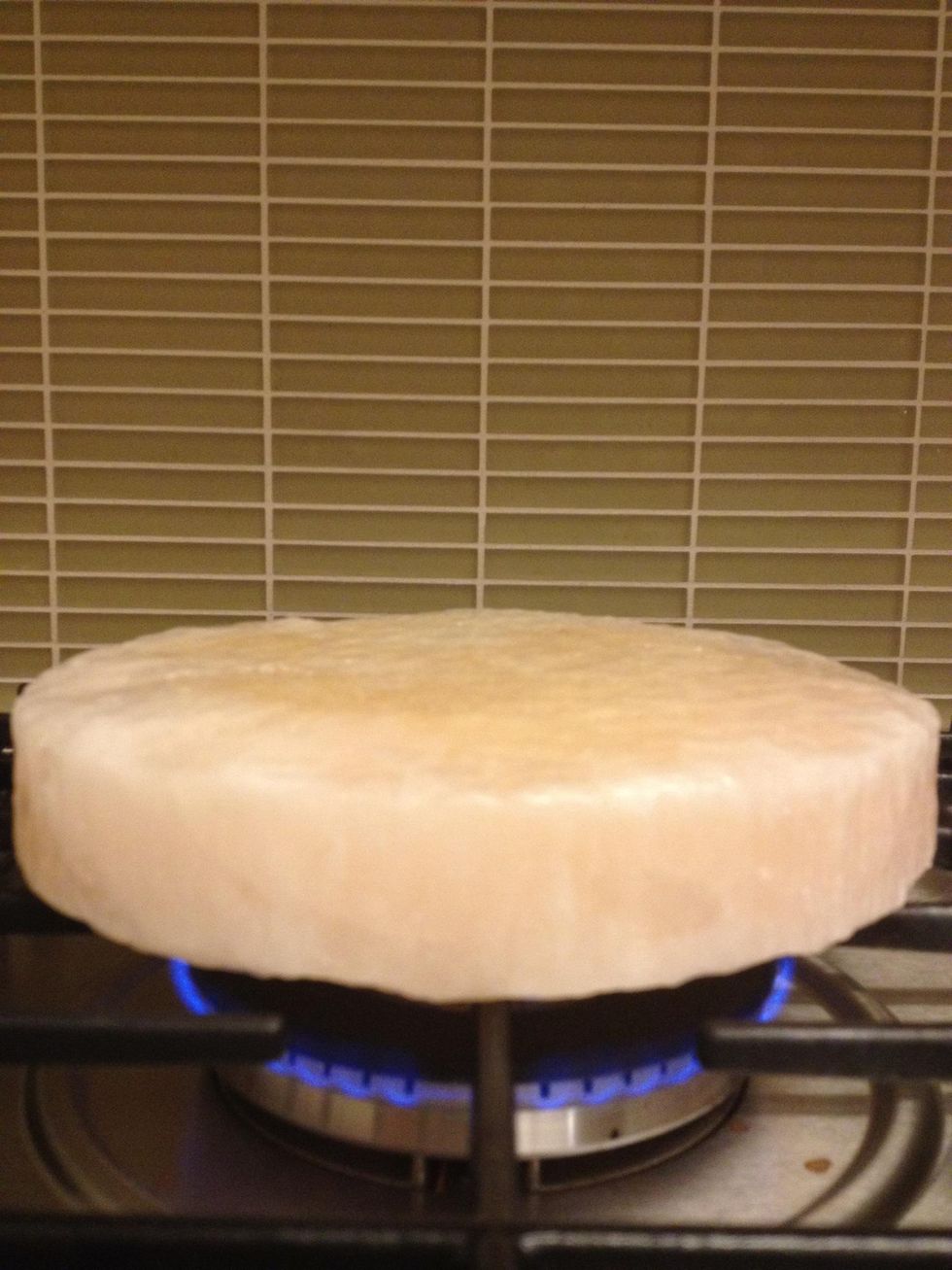 You will need a salt block of at least 1 inch thick, preferably 1.5 inches thick. To start your cooking, place your salt block on a gas burner over LOW heat.