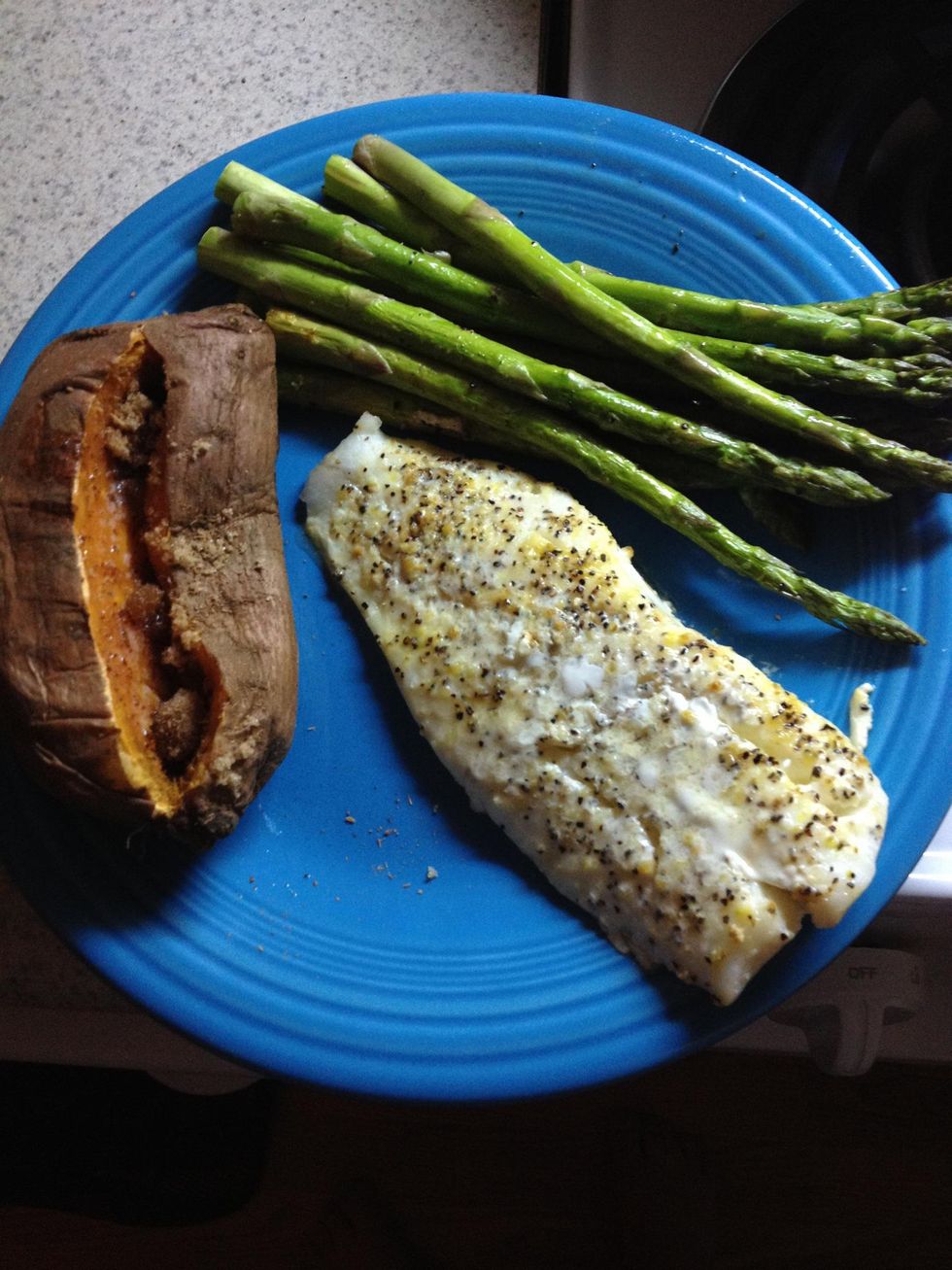 Take the fish out of the package & put it in the dish by the asparagus. Sprinkle with lemon pepper (or any seasoning you like!). Bake for 15-20 minutes (or until the fish is opaque & flaky).