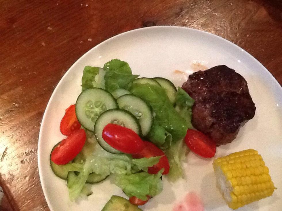 Corn Lettuce Tomato Cucumber Dressing Eye Fillet SteakMaking the saladWashing the lettuce.CucumberTomatoThe saladCooking the steakFinished product