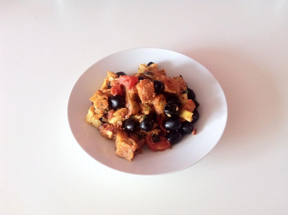 Add artichoke, olives, chili and Provence herbs. Fry for a few more minutes. (Keep mixing)