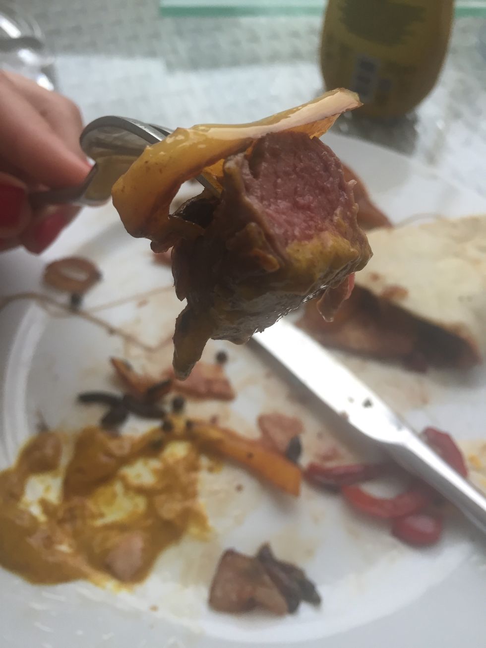 Voila !!!! Put the pita first then the steak with the peppers on a plate