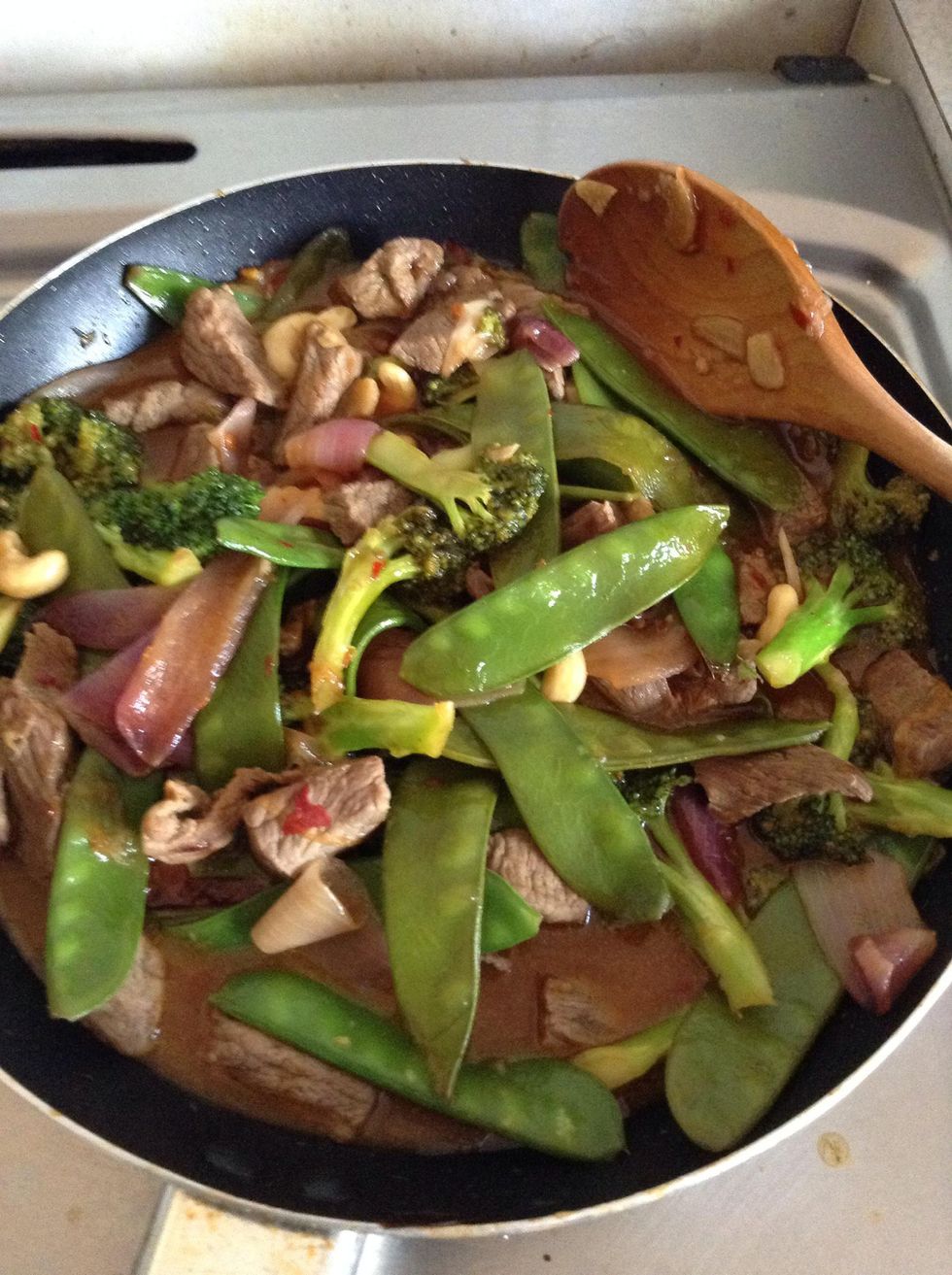 Add in beef before smaller/softer vegetables. At this point the mangetout should be ready at same time as broccoli. Add cashew nuts for that oriental addition if you wish.
