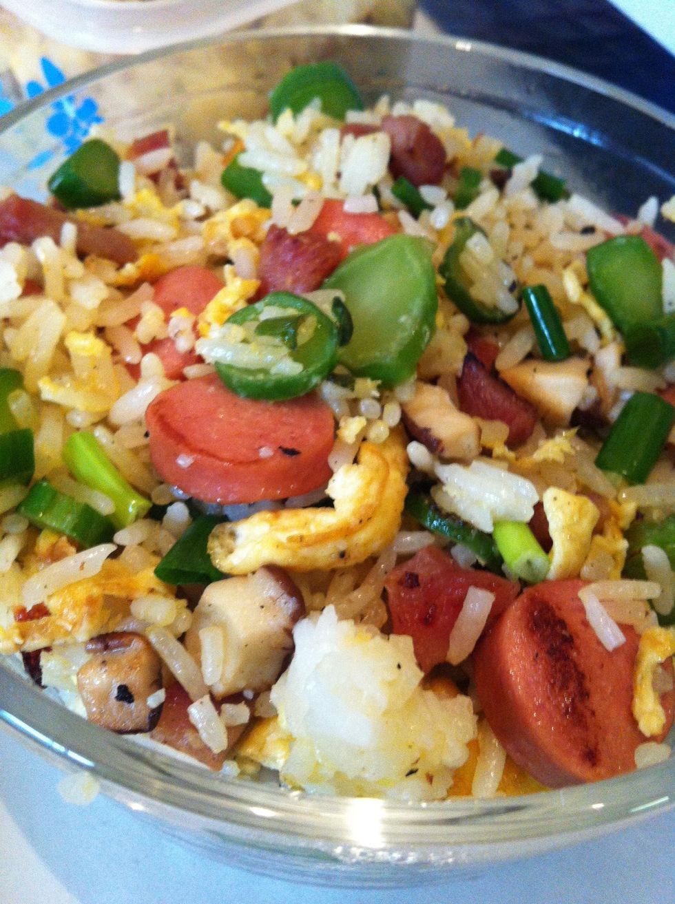 Put the cooked rice into the wok immediately after you pour the eggs, keep stirring until all rice turn yellow color as covered by eggs.