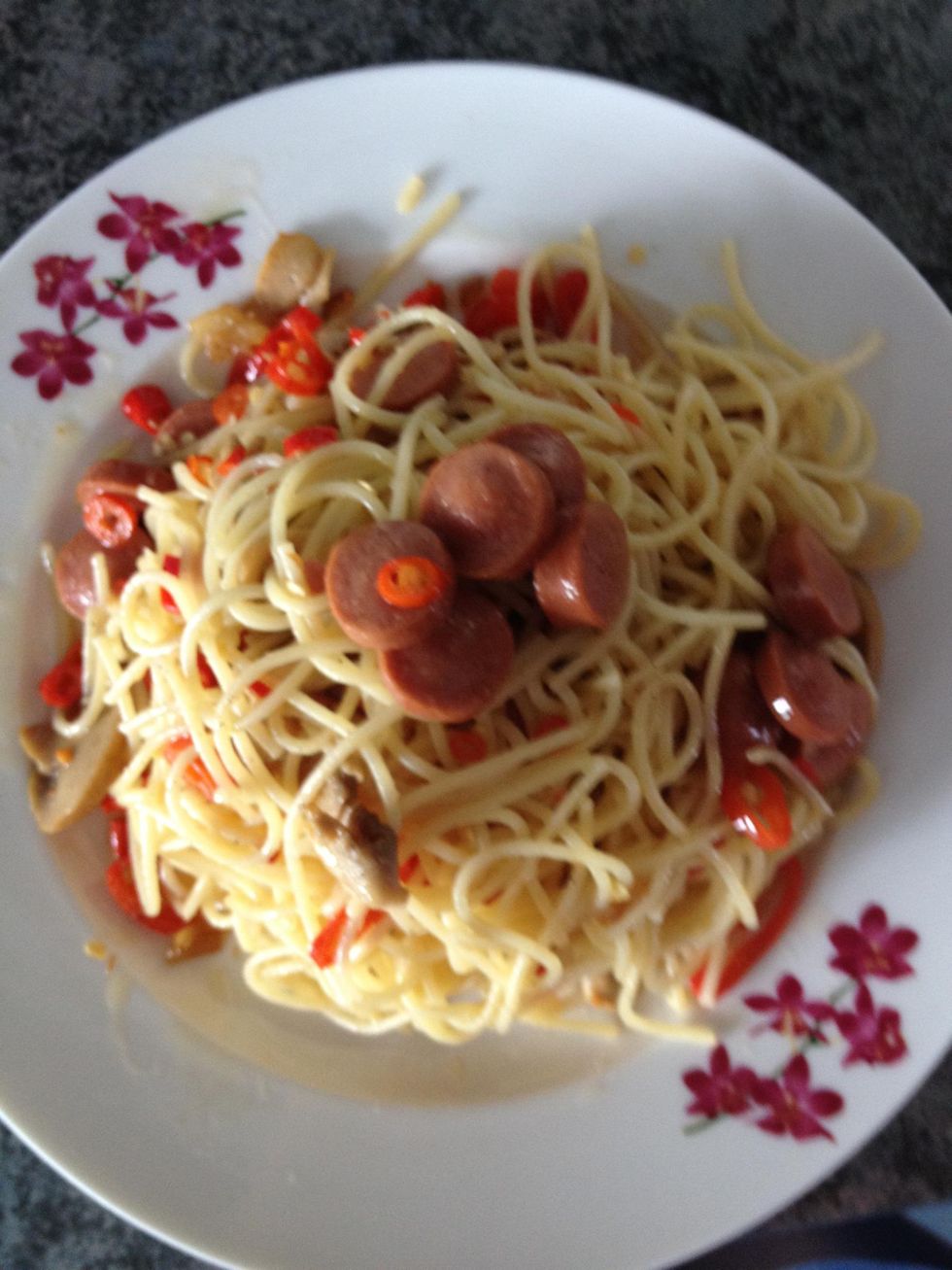 Add in your garlic first. To start of the smell for your AGLIO OLIO. Garlic is very important.