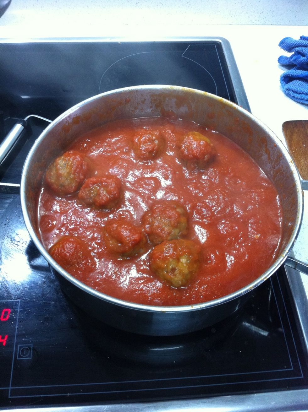 Ingredientes: - Albóndigas: carne picada ternera, un huevo, ajo, cebolla, bacon y un poco de pan rallado. - Salsa tomate: tomate natural triturado, sal, azúcar, medio vaso vino blanco.