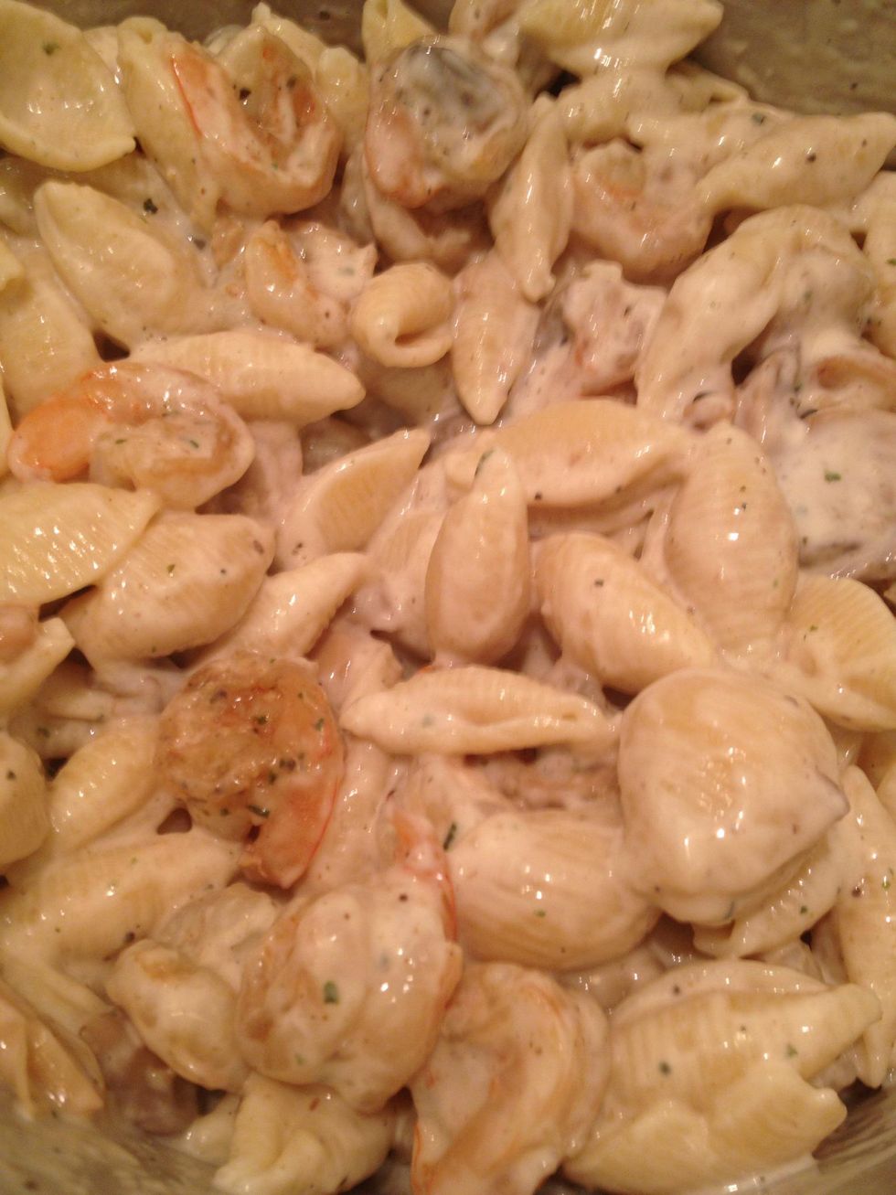 Boil pasta until it becomes soft to taste.Add seasoning to shrimp and cookAdd Alfredo sauce to pasta when cooked and mixAdd mushrooms to pasta.Mix shrimps and pasta. Enjoy!