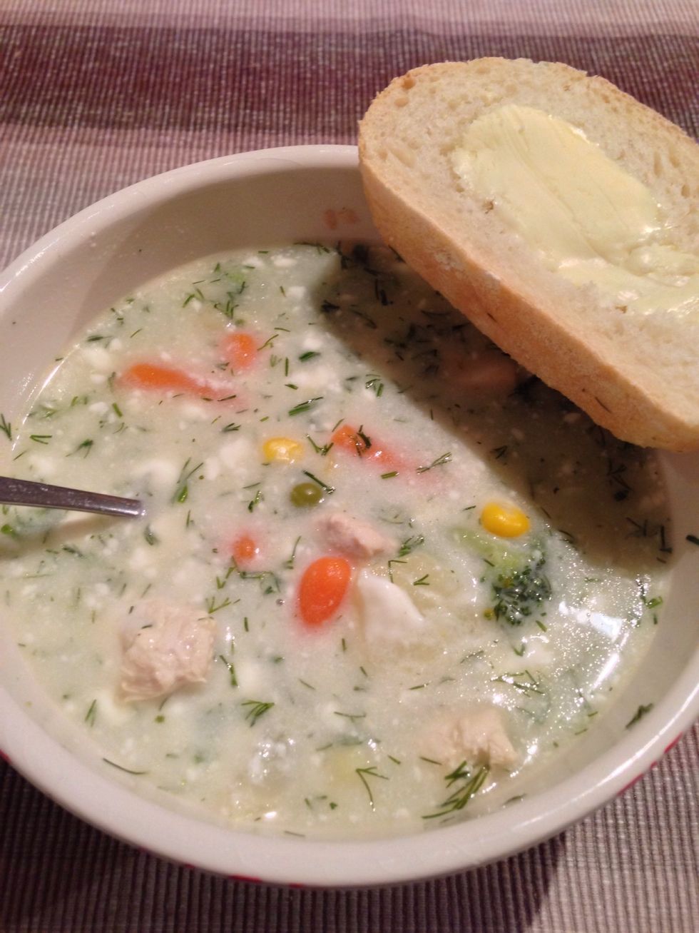 Put your soup into a bowl and top it with around 2 tablespoons of creme fraiche. Mix it in.