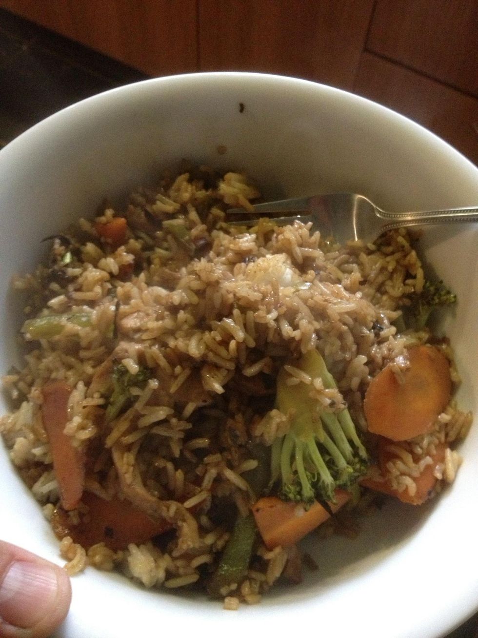 Toss in the chicken, garlic and ginger. Keep tossing, watching to ensure the chicken cooks through. Then add the sauce, two cups of rice and cook until the sauce thickens.