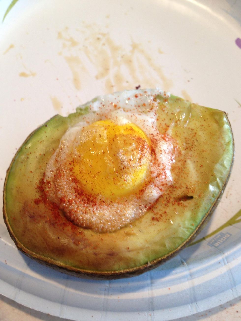 Put the avocado in the pan, the egg in the avocado and the pan back into the oven. Cook until the egg is how you like it. I like my eggs between med and hard. My oven took 13 minutes.