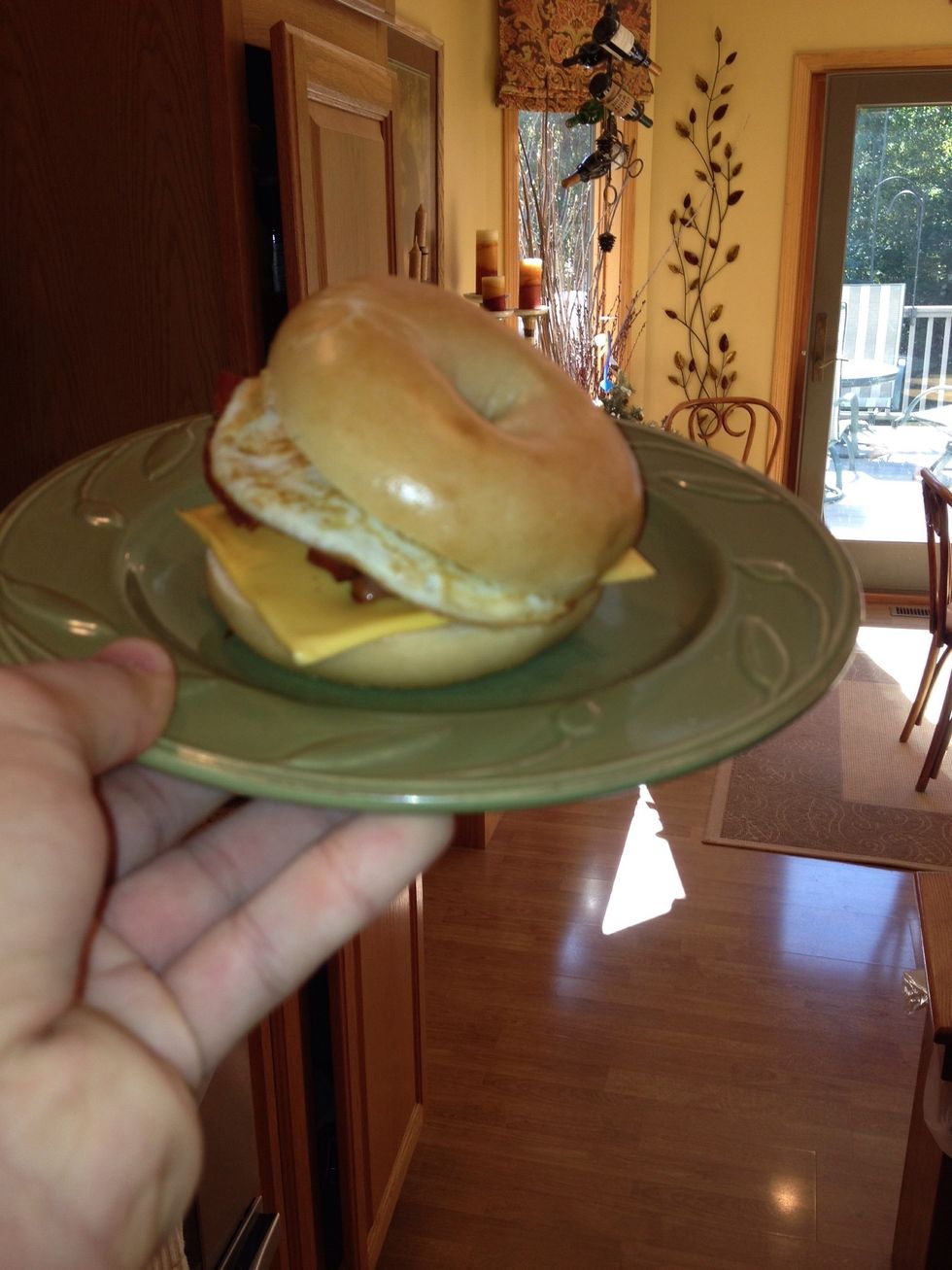 The last step is to place the fried egg on top of your bagel, and placing the other side of the bagel on top, making a sandwich. Enjoy your egg mcmuffin!!