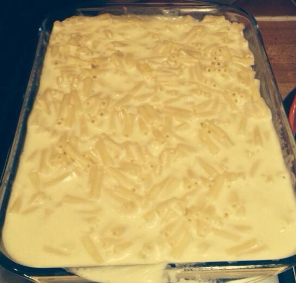 Drain the pasta and put it in a large baking tray, pour the cheese sauce over the pasta and stir.