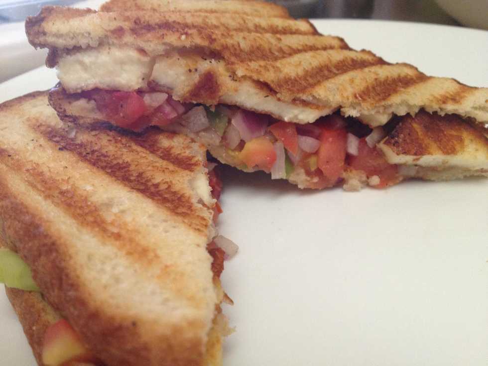 No panini grill? No problem!!! Brush butter on a pan place the sandwich on it. Put a heavy plate or another pan on the sandwich. Once done on one side butter the other side and flip :) Enjoy!!!