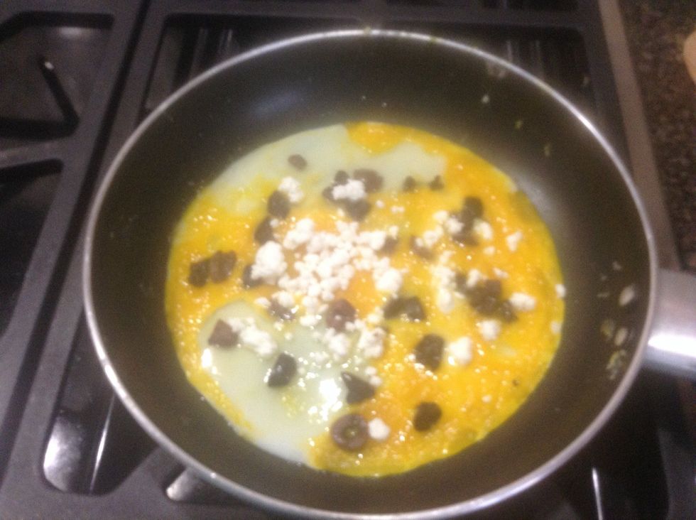 Finally, add the goat cheese and keep the omelette on the burner until the goat cheese has melted.