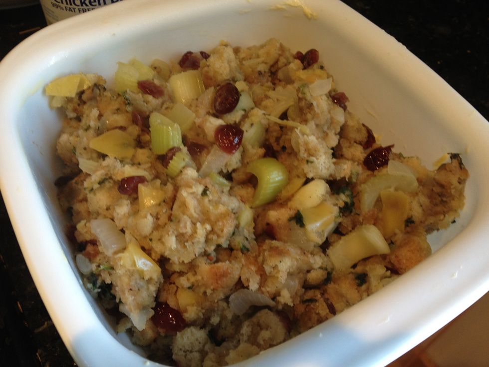 Add between a half cup and a full cup of chicken broth (or veggie broth) to the mix. The bread cubes should be wet but not moist.