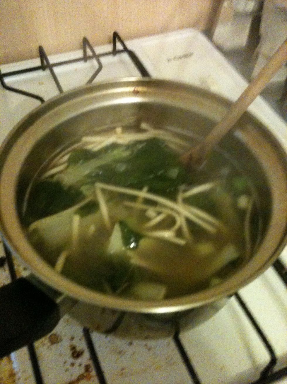 Add the noodles to the stock and let it boil for a few minutes.
