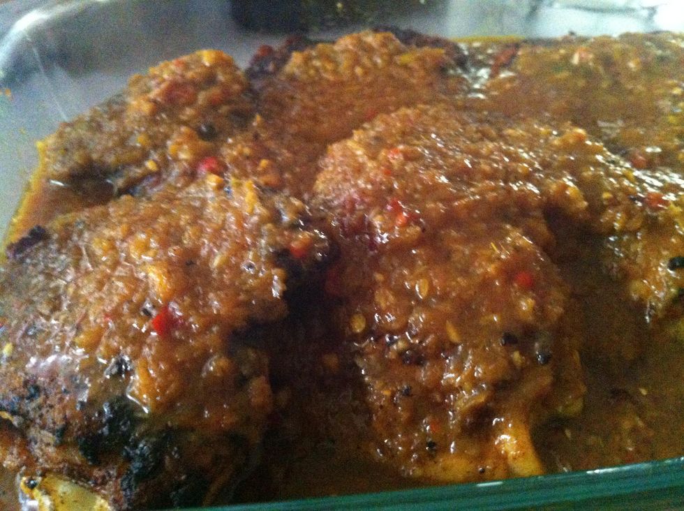 Bake the chicken at 150deg C for an hour. The basting sauce will caramalise. Serve it hot with plain, coconut or turmeric rice.