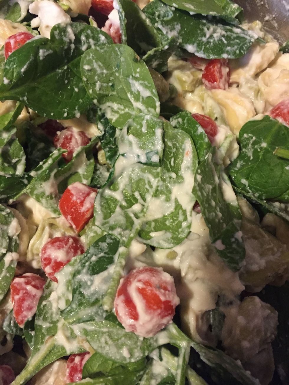 1. Strain your pasta keep the pasta in the same pot you boiled it in. 2. Add the Ricotta cheese mix it in carefully 3. Add your grape tomatoes, diced garlic, & baby spinach to your pasta mix/w care
