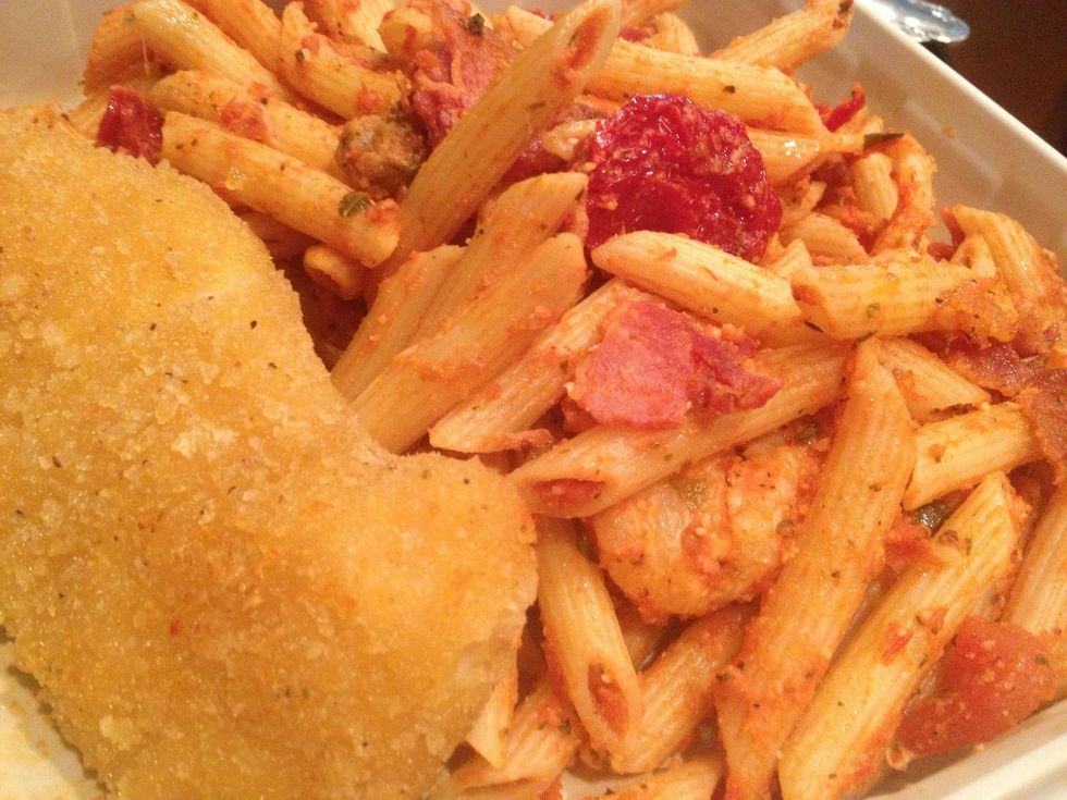 Add the bacon drippings. Also, add the bacon and sausage to the pasta.