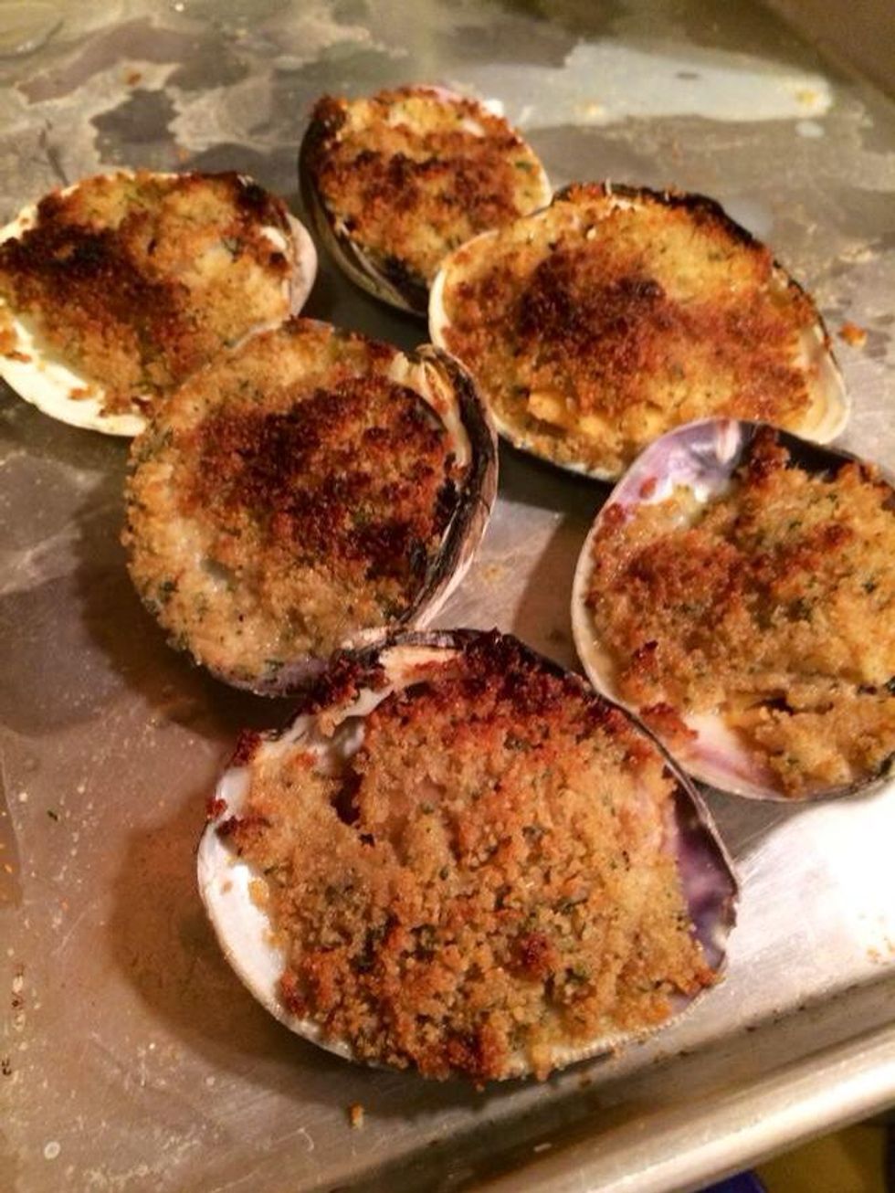 Place your clams in the pre heated oven & cook for about 15-20 min. or until the tops are browned. Shouldn't take long, just keep watch to not over cook them or they will dry out & that is a nono.