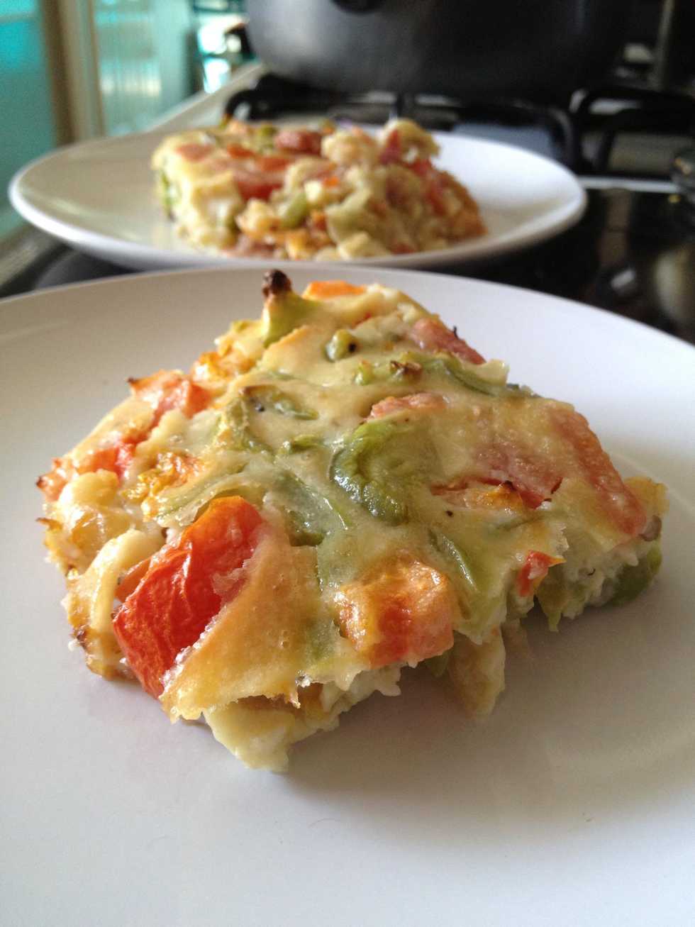 Last step is to test omelette with wooden toothpick (pierce it through from top to bottom and remove it) – if it does come out clean – baked omelette is ready.